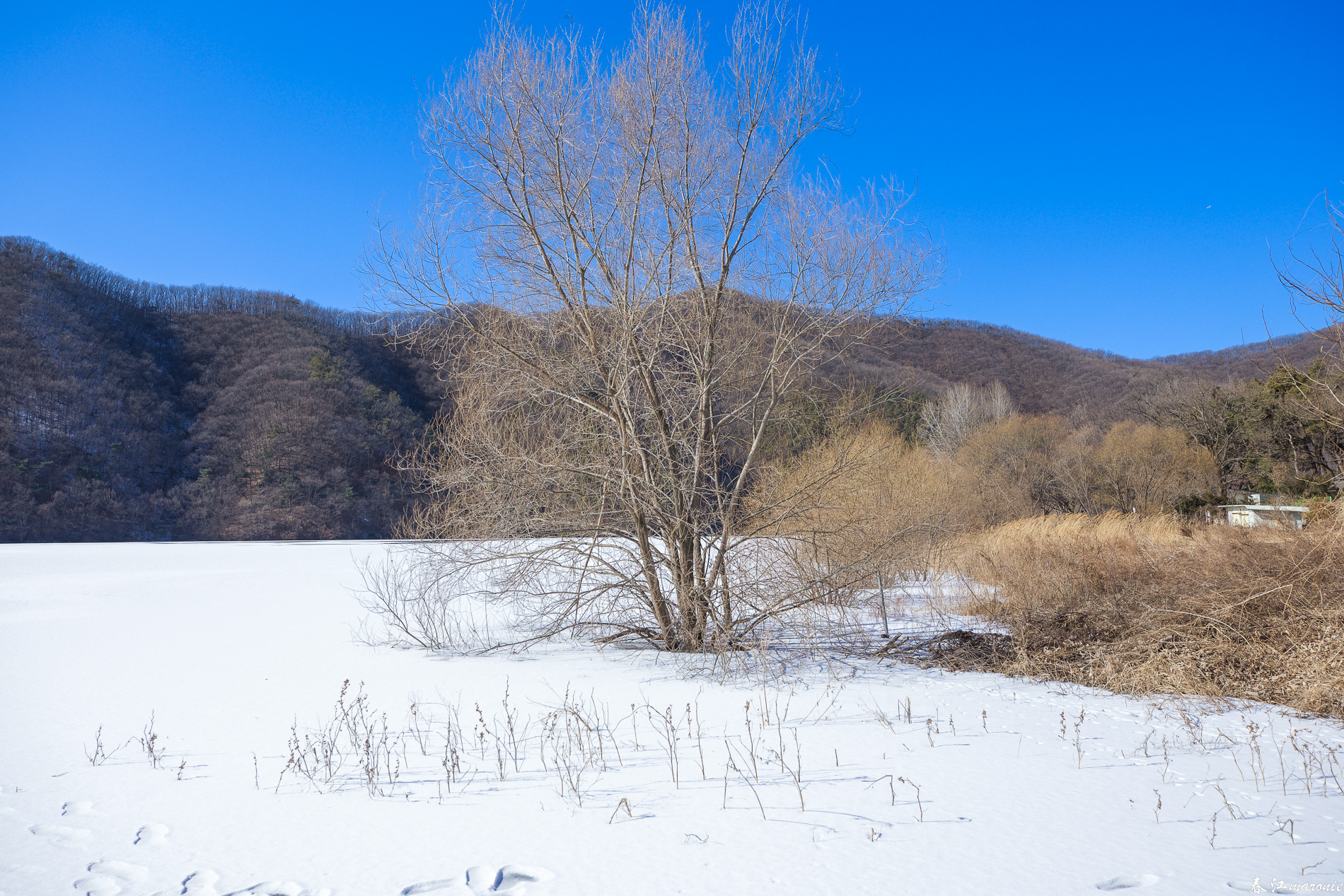 미루나무 한 그루가 멋지게 얼음판에 뿌리를 박고